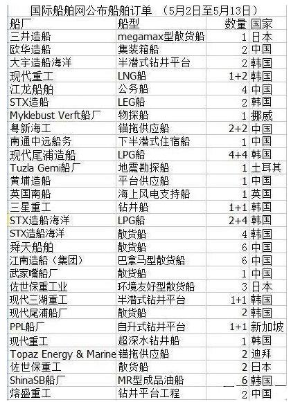 根據(jù)國際船舶網(wǎng)公布的5月2日至5月13日的船舶訂單來看,鉆井船和液化船高端領(lǐng)域的表現(xiàn)異常搶眼;中日韓仍然是世界上訂單最為活躍的三個國家。其中,韓國在高端造船上顯示出“誰與爭鋒”的氣勢,中國在高端領(lǐng)域亦有所收獲,但仍然以傳統(tǒng)造船為主,日本已經(jīng)走環(huán)保路線。