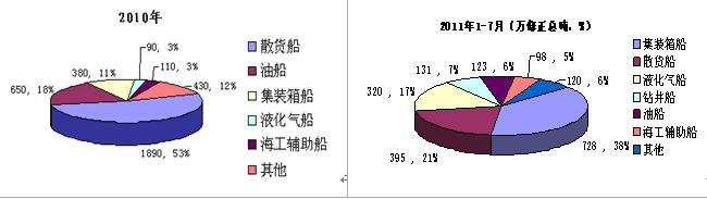 第一,2011年新船成交量再度大幅回落已成定局,細(xì)分船型市場輪動性進(jìn)一步加強(qiáng)。按今年1-7月成交態(tài)勢測算,今年全年成交量大致在8000萬載重噸左右,較上一年下滑幅度極有可能超過40%。從細(xì)分船型市場發(fā)展而言,下半年散貨船市場總體上持續(xù)低迷;油船市場成交量可能會出現(xiàn)明顯改善;集裝箱船、液化氣船、大型海洋工程裝備產(chǎn)品以及個(gè)別特種船型在整個(gè)新造船市場中表現(xiàn)或作用將更加突出,但下半年這些細(xì)分市場行情可能較上半年有所遜色,應(yīng)引起大家關(guān)注。