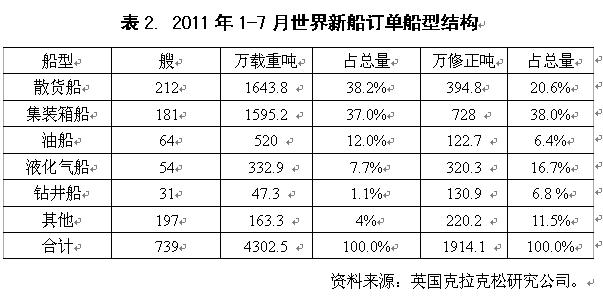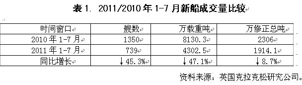 2011年1-7月全球造船三大指標(biāo)均出現(xiàn)不同程度下滑。據(jù)英國克拉克松公司統(tǒng)計(jì),1-7月份世界共成交新船訂單739艘、4302.5萬載重噸,較去年同期分別下降45.3%和47.1%,以修正總噸計(jì),成交量達(dá)1914.1萬修正總噸,同比下降8.7%;全球新船完工量1380艘、8967.4萬載重噸,同比下降5.6%;截止到2011年7月底,全球手持船舶訂單量6849艘、42118.5萬載重噸,較年初下降10%左右。