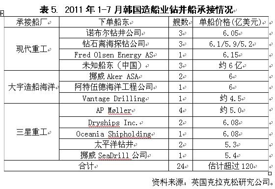 第二,韓國船企基本上壟斷大型海工裝備市場。截至到7月底,全球共有31艘鉆井船成交,除了7艘由巴西南大西洋船廠(三星重工持有該廠股份,并為其提供技術(shù)支持)承接之外,其余船舶均被韓國三大造船集團(tuán)囊括,總價(jià)值金額超過120億美金,相當(dāng)于220艘18萬噸級好望角型散貨船價(jià)值量(當(dāng)前價(jià))。除鉆井船外,韓國船企還承接了價(jià)格不菲的FPSO(浮式生產(chǎn)儲存與卸載系統(tǒng))、FPSO/LNG和FSO(浮式產(chǎn)品儲存與卸載系統(tǒng))訂單。與此形成鮮明對比的是,這一期間其他造船國承接到上述產(chǎn)品卻寥寥無幾。