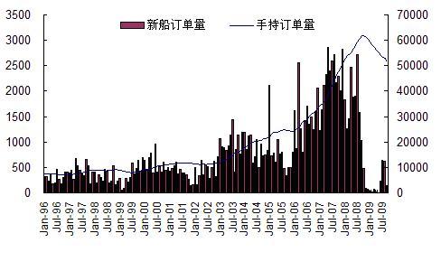 據(jù)英國(guó)克拉克松公司統(tǒng)計(jì),今年1-9月全球累計(jì)成交新船238艘、1896萬載重噸,同比下降88.3%;截止到2009年9月底,全球手持船舶訂單總量降至8671艘、5.17億載重噸,以載重噸計(jì),較去年10月歷史最高位下降了20%。