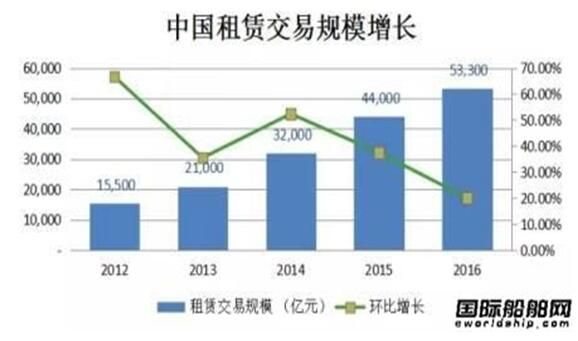 根據(jù)中國租賃聯(lián)盟發(fā)布的數(shù)據(jù),截至2016年底,我國融資租賃合同余額約53,300億元,年較2007年業(yè)務(wù)量增長超過200倍,年均復(fù)合增長率高達(dá)82.27%。