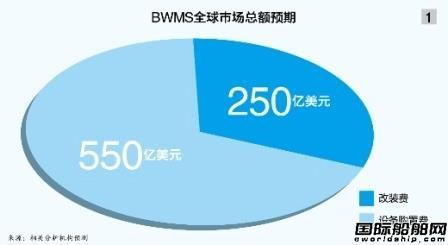 相關(guān)分析機(jī)構(gòu)做出預(yù)測稱,《壓載水公約》生效后將給BWMS制造商帶來近800億美元的市場總量,對于BWMS這種船配市場的輕量級產(chǎn)品來說,這個(gè)數(shù)字是驚人的。另據(jù)某投行交通事業(yè)部的進(jìn)一步分析,這塊800億美元的“大蛋糕”由占總比68.75%、總額達(dá)550億美元的設(shè)備購置市場和占總比31.25%、總額達(dá)250億美元的改裝市場構(gòu)成(見圖1)。