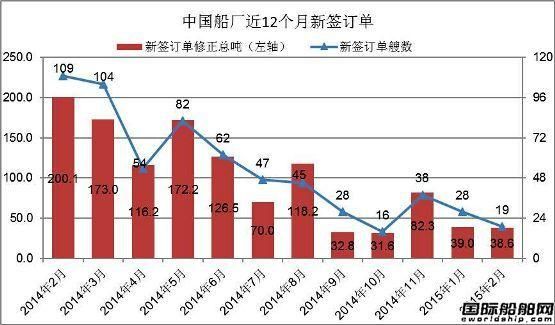 據(jù)克拉克松統(tǒng)計(jì),2015年2月,中國(guó)船廠接單量為19艘, 38.6萬(wàn)CGT,環(huán)比下降了1.0%,同比下降了76.9%;近12個(gè)月,中國(guó)船廠的接單量呈下降的趨勢(shì);2015年1-2月,中國(guó)船廠接單量為77.6萬(wàn)CGT,較2014年1-2月下降了79.8%