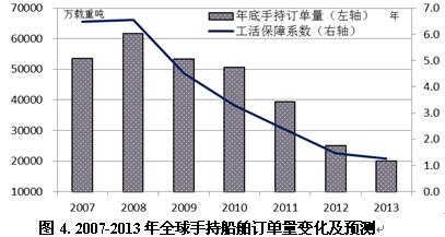 2013年度手持訂單量預(yù)測(cè)。按照上述預(yù)測(cè),根據(jù)大致測(cè)算公司“期末手持訂單量=期初手持訂單量-期間造船完工量+期間新船訂單量-期間訂單撤銷量”,預(yù)計(jì)2012年底全球手持船舶訂單量降至2.5億載重噸,2013年可能進(jìn)一步跌破2億載重噸。全球造船業(yè)工活保障系數(shù)由2007年6.6年將跌至2012年底1.6年,2013年進(jìn)一步下滑至1.25年(以1.6億載重噸有效產(chǎn)能測(cè)算),預(yù)計(jì)2013年全球?qū)⒂懈嗟拇瑥S面臨無(wú)船開工的局面。