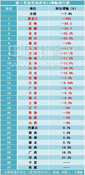 中國(guó)經(jīng)濟(jì)網(wǎng)記者疏理制作了前三季度各地進(jìn)出口情況表,表中可以看出外貿(mào)形勢(shì)的復(fù)雜與嚴(yán)峻性,除了寧夏、西藏兩地未公布數(shù)據(jù),在已經(jīng)公布的29個(gè)省區(qū)中,有22省區(qū)外貿(mào)進(jìn)出口值均為負(fù)增長(zhǎng)。其中黑龍江情況最差,以同下降42%為全國(guó)倒數(shù)第一,吉林同比下降25.2%倒數(shù)第二,新疆同比下降23.7%倒數(shù)第三。東北三省在做整體經(jīng)濟(jì)不振的情況下,進(jìn)出口貿(mào)易受到的不良影響也十分明顯。